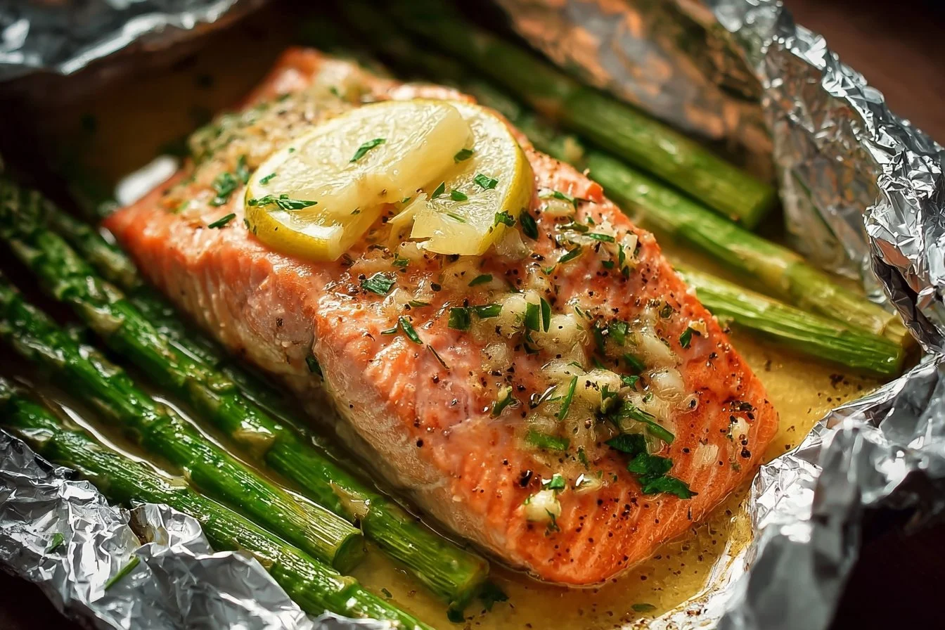 Baked Salmon in Foil with Asparagus and Garlic Butter Sauce