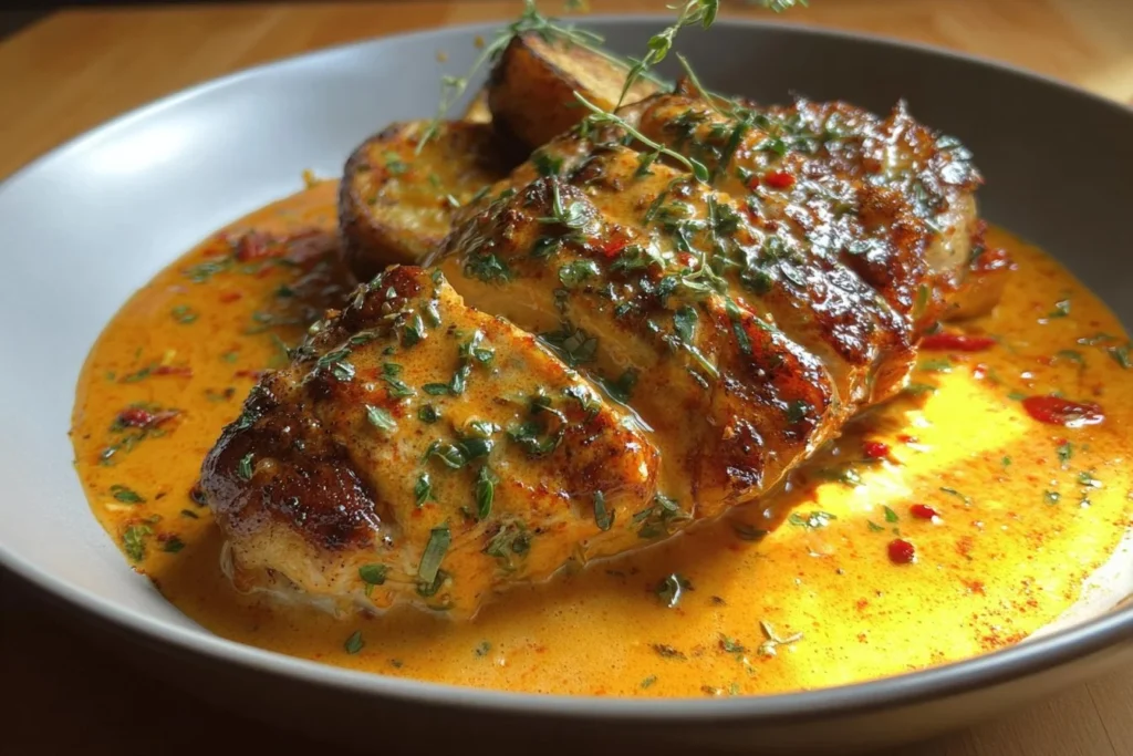 Serve the chicken with the creamy sauce and golden potatoes. You can garnish with fresh herbs if you’re feelin’ extra, but honestly, I usually forget. Just get it on your plate, right?