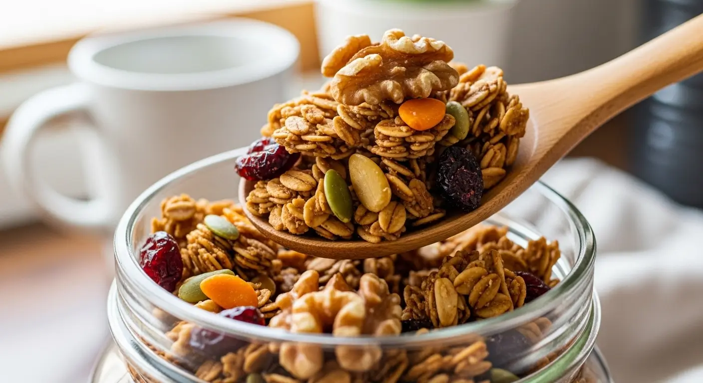 Easy homemade maple walnut granola recipe with crunchy oat clusters, walnuts, pumpkin seeds, and real maple syrup. Perfect make-ahead fall breakfast and meal prep option ready in 45 minutes.